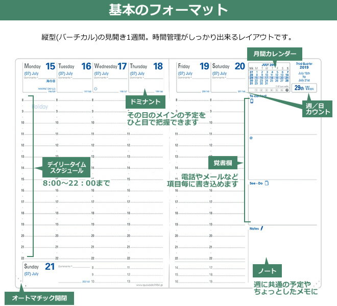 この手帳のレイアウト内容【手帳週間縦軸】※この商品は『ビジネス』です。