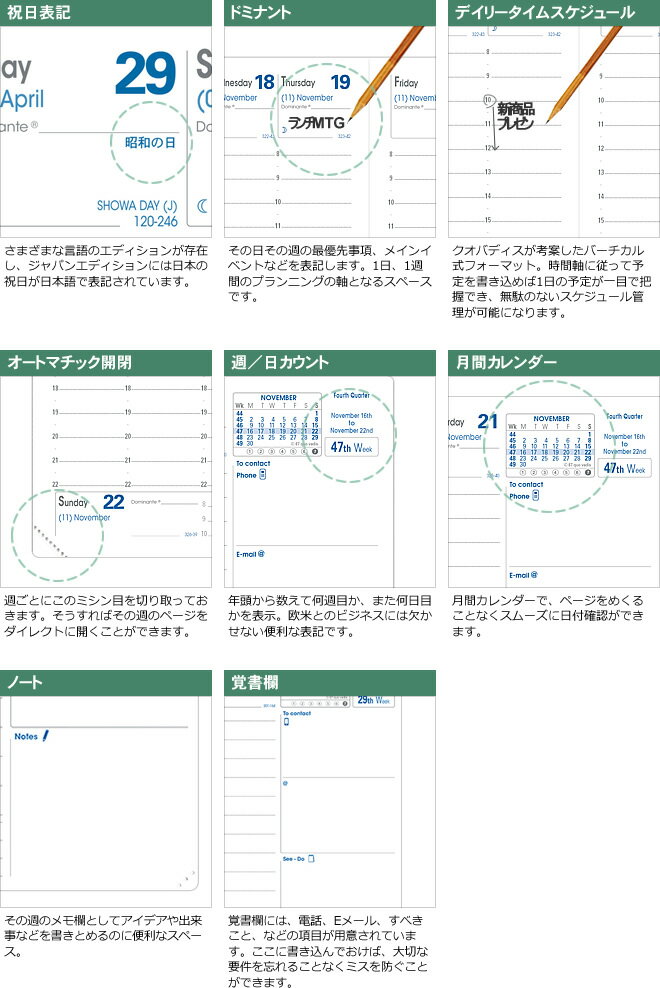 文房具なら和気文具(ワキ文具)[quo2020][tag:クオバディス][tag:手帳][tag:週間タテ型][tag:Sサイズ(長辺13〜16cm未満)][tag:12月始まり]■ビジネスの特徴半世紀前、フランス人に発明と呼ばれたクオバディス。